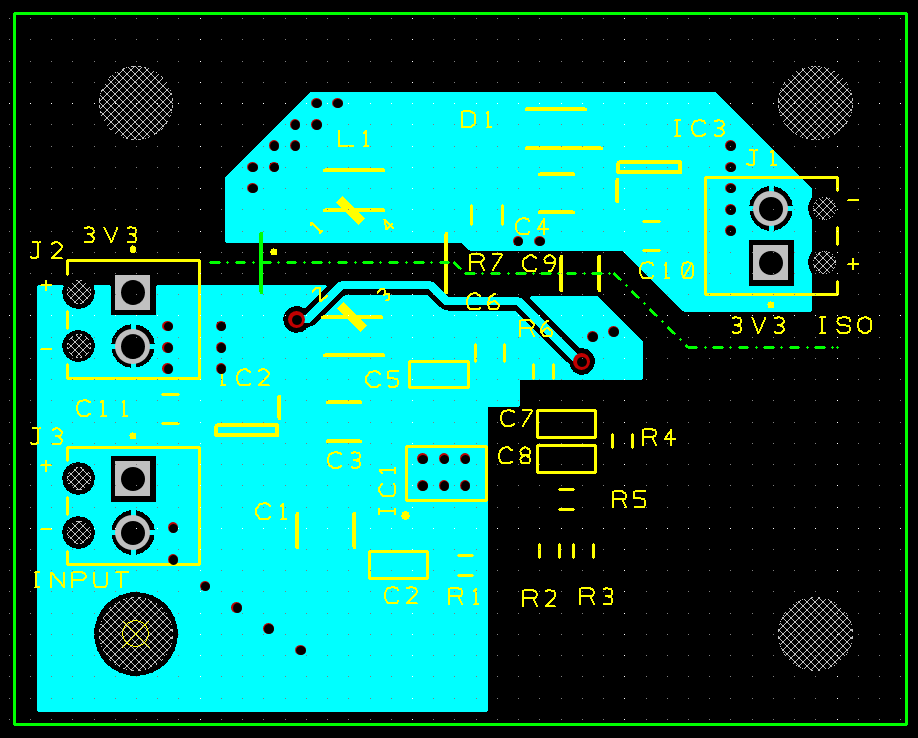Note the gap between the Input supply ground and the isolated ground, this matches the Würth design and also the pad spacing of L1 and C7.