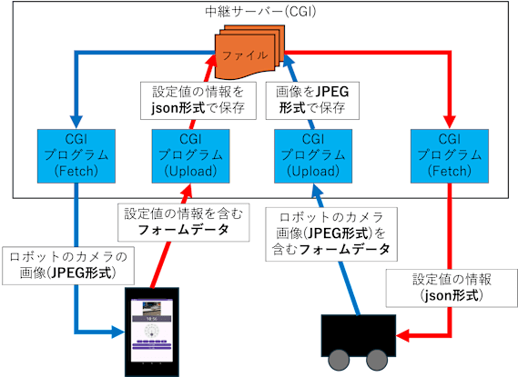 通信部のデータフローは詳細には以下のようになる。ロボット側がカメラ画像を送信・Android側がアラーム設定や操作コマンドをCGIサーバーにアップロードし、もう片方がCGIサーバーからそれらをダウンロードする。