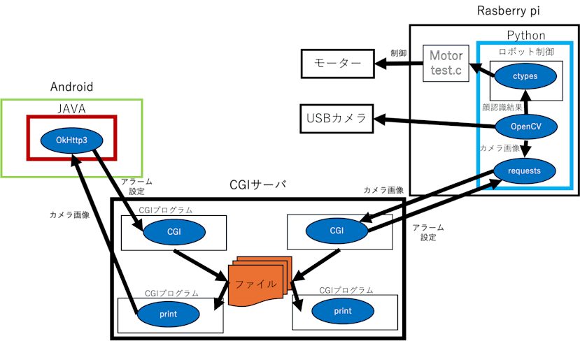 本作品はAndroidアプリ、仲介するCGIサーバーおよび目覚ましロボット本体からなる。
