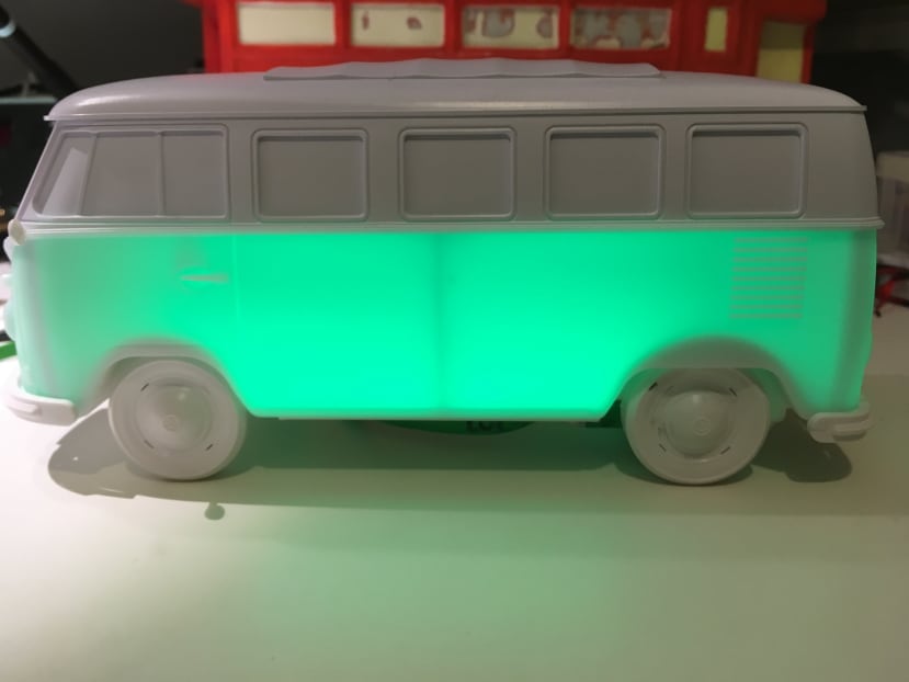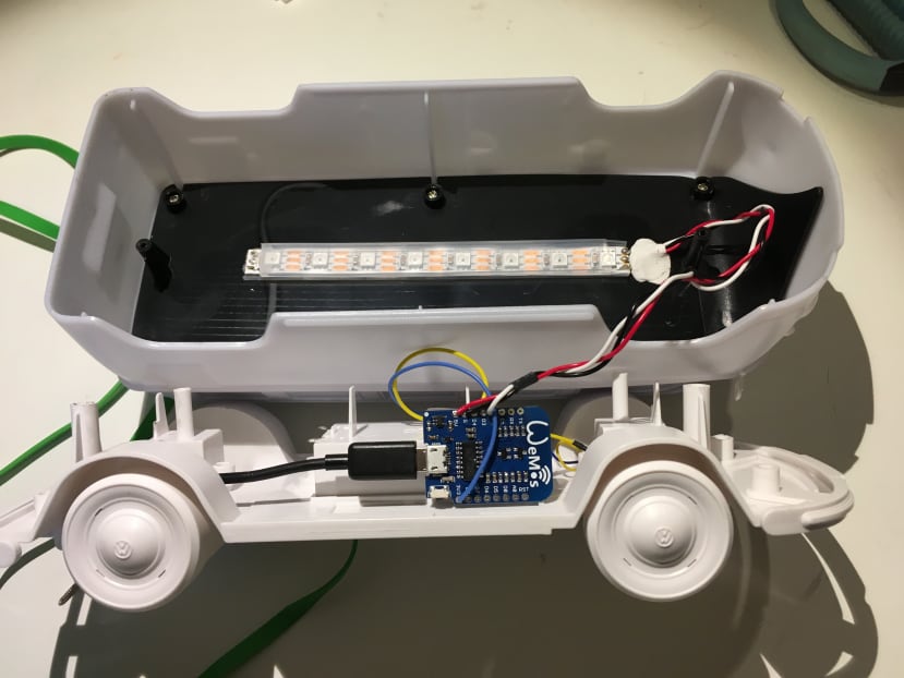 Stick the neopixels to the inside top, and place the WeMos inside the camper. Use a micro USB extension to connect the Pi to the USB socket in front of the back wheels.