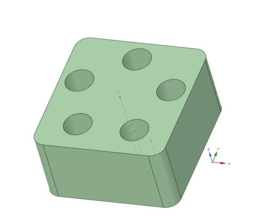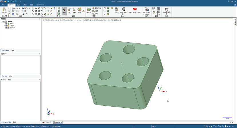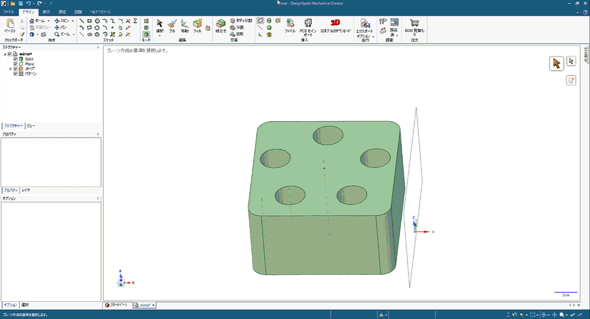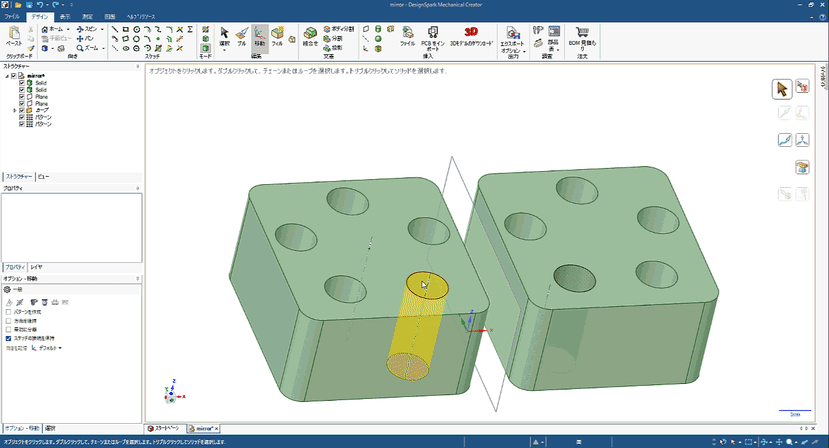 今回のモデルでは、5つの貫通穴をパターンで作成しています。ミラー関係が維持された状態で片方のパターン数を変えると、どちらも同じ数に変化します。便利ですね。