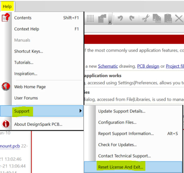 Klicken Sie auf Hilfe -> Support ->'Lizenz zurücksetzen und beenden'. Starten Sie dann DSPCB neu und melden Sie sich erneut mit Ihrem DesignSpark-Konto an.
