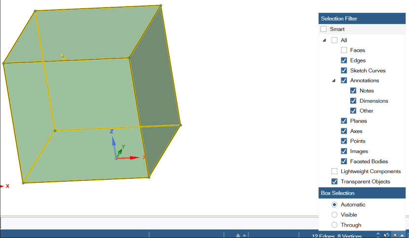 17. 为了使立方体的边缘变圆,用 Ctrl + 左键单击多次选择边缘(要选择所有边缘,您需要使用鼠标中键并移动鼠标来翻转立方体)。为了更容易地选择所有的边缘,您可以通过取消选择智能和面来编辑选择过滤器(屏幕底部的白色光标箭头),然后(仍然在拉动模式下)拖出一个包围模型的方框。