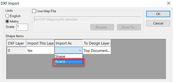 Wählen Sie im daraufhin geöffneten Fenster unter „Import As“ (Importieren als) den Typ „Board“ (Platine) aus.