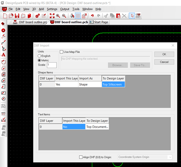 On the window that opens, select the “Import As” option, type “Shape” and select the “To Design Layer” as “Top Silkscreen”. Set any items in the “Text Items” field as “No”.