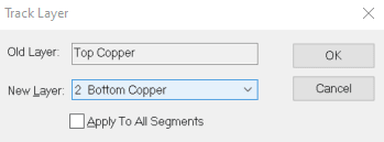 配線作業中、トラックをある層から別の層へレイヤ変更したい場合(表面から裏面に配線を移動させたいような場合)、<L>キーを押して<Enter>キーを押すだけで、これを行うことができます。<Enter>キーは、ダイアログの[OK]ボタンをクリックするのと同じように機能します。これにより、ダイアログを見ることなくレイヤを変更することができます。