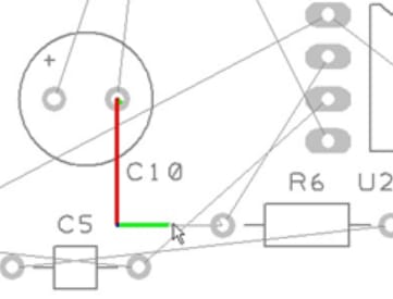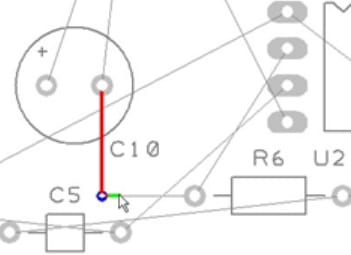 接続先の端子の上までカーソルを移動したら、1回クリックして、この配線作業を完了します。トラックの色が赤や水色になり、このトラックが表と裏の別々のレイヤにあることが示されます。