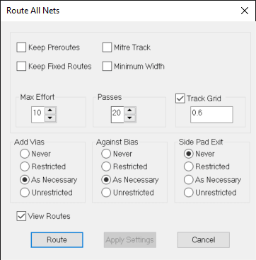 ダイアログの下部にある[Route (配線)]ボタンをクリックして、配線機能を開始します。この単純なデザインの場合は、わずかな時間ですべての配線が行われます。