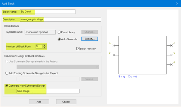 Next, create your schematic for the block and also add the block "ports" which will be the hierarchical links. From the menu bar select Add - Block Port.