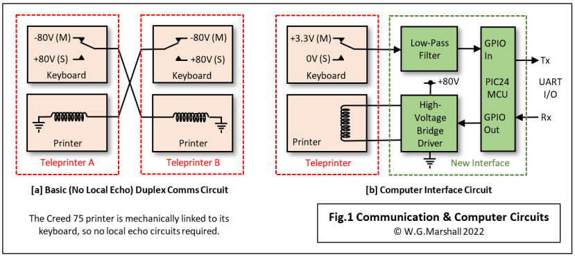 Before delving into the ins and outs of turning a teleprinter into a computer terminal, here is a brief explanation of how it worked in its original role. Take a look at Figure 1a, which shows a simplified comms system with two teleprinters that could be miles apart.