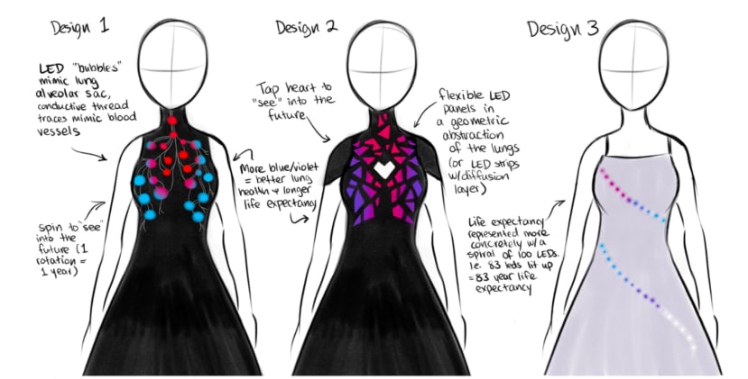 大気(質)センサーは蓄積的な健康ダメージや長期的な肺の健康状態を示すことはできません。このプロジェクトでは特に時間経過の側面に焦点を当てることで、ドレスをタイムマシンのように用いて時間とともに肺の健康状態がどのように変化していくかを可視化してくれます。具体的には、ドレスのLEDの発光が単に現在の空気の質だけでなく、長期的な”未来の肺の健康”を見せてくれます。