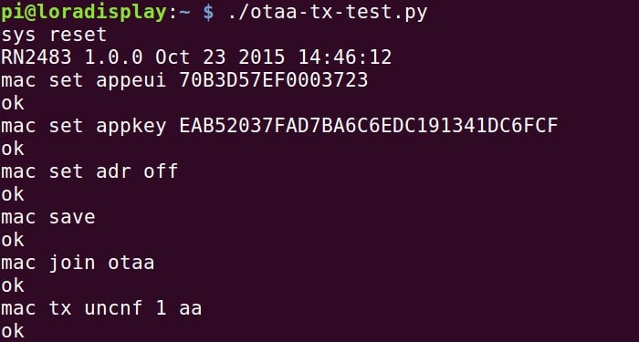 At this point the configuration was tested by running a Python script that joins the network before performing uplink — that is, sends messages up to the network.
