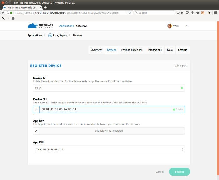 First a new application was configured via The Things Network console. Following which a device could be registered to this, but for which the DevEUI was required.