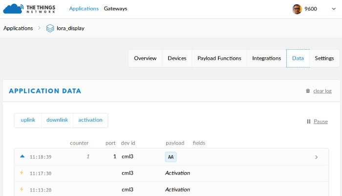 TTN Console was then used to confirm that the device had succeeded in joining and that messages were indeed being received.