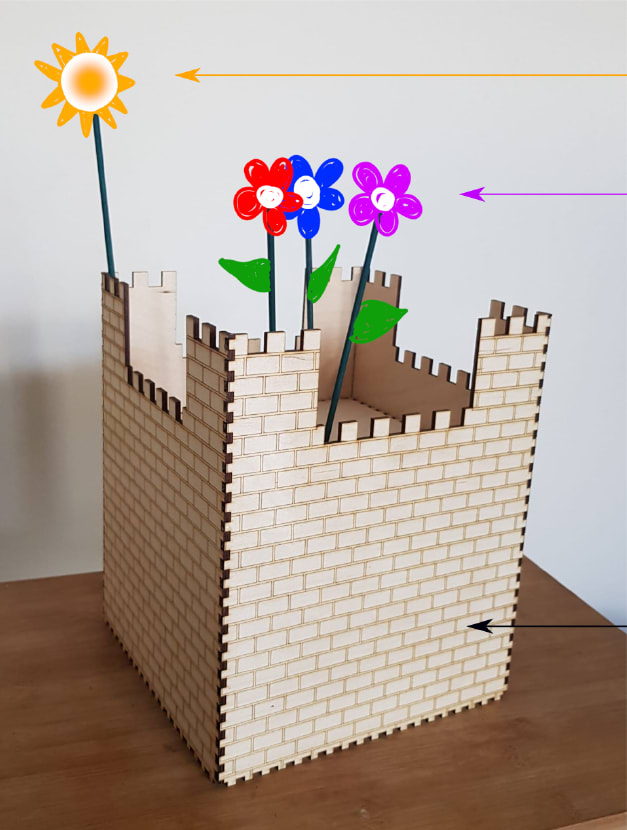 Purple arrow - Fabric flowers. One of the petals is attached using conductive velcro. To record that you're experiencing hayfever symptoms, pull the petal off.
