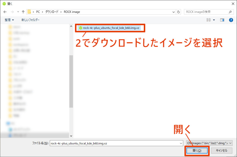 2でダウンロードしたイメージを選択して、開きます。