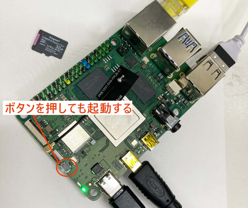 必要な周辺機器を接続して起動します。ちなみに、ROCK 4C+は電源ケーブルを挿しても起動しますが、オンボード上の電源ボタンを押すことでも起動できます。
