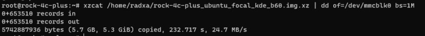 # xzcat /home/radxa/rock-4c-plus_ubuntu_focal_kde_b60.img.xz | dd of=/dev/mmcblk0 bs=1M