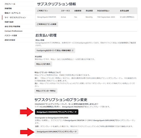 アカウント設定ページの マイ・サブスクリプションエリアからサブスクプランの変更などが行えます。