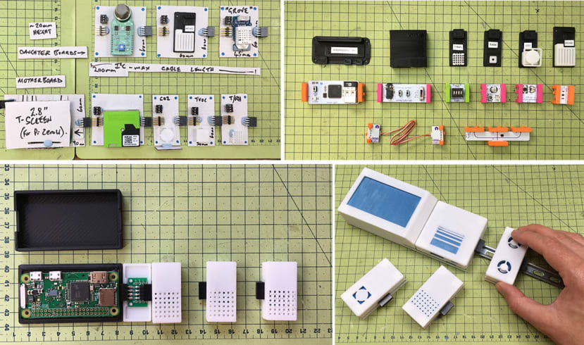 Une variété de capteurs Sensirion, ainsi qu'une collection de Little Bits (un jouet électronique STEM prêt à l'emploi) ; premier concept « plug-n-play » avec un micro-ordinateur Pi Zero pour les capteurs ; modèle réduit imprimé en 3D des unités de capteurs.