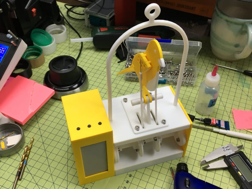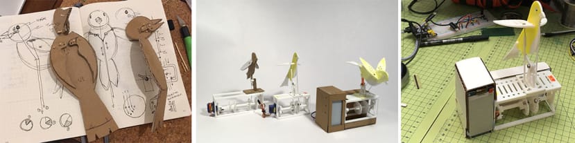 Prototypes en carton et imprimés en 3D des mécanismes et de l'électronique de l'automate Canari.
