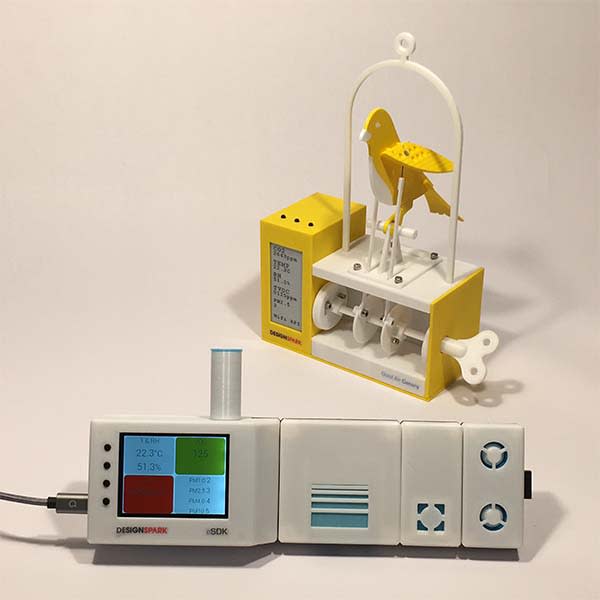 このボードはWiFiに接続することが可能で、DesignSpark環境センサー開発キット(ESDK)からセンサーデータを受信するMQTTクライアントを実行し、JSONメッセージを処理してサーボを制御し、巧妙な機械的メカニズムでカナリアを作動できます。サーボはPWMサーボ制御ボードで駆動し、アンプ内蔵の専用オーディオボードとシングルスピーカーを装着して高音質な音声を提供します。