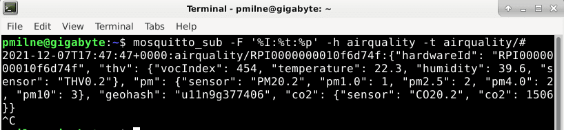 mosquitto_sub -F '%I:%t:%p' -h airquality -t airquality/#