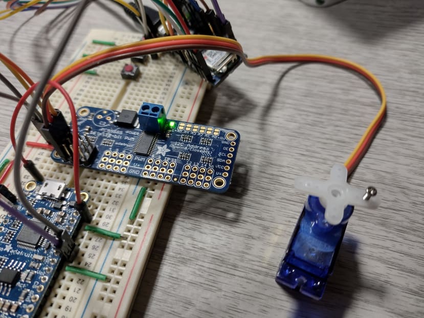 このボードはArduinoの3.3Vピンから供給される3.3V(VCC)で動作します。サーボはリニアレギュレータから別の5V電源(V+)を持っています。通信はI2Cインターフェースで、メーカーから提供されたドライバライブラリを使用しています。当初はカナリア用に複数のサーボが必要と考えており、ハードウェアとプログラミングを簡単にするためにこのボードを採用していました。結果的には必要ありませんでしたが応用も考えて特に変更をしませんでした。