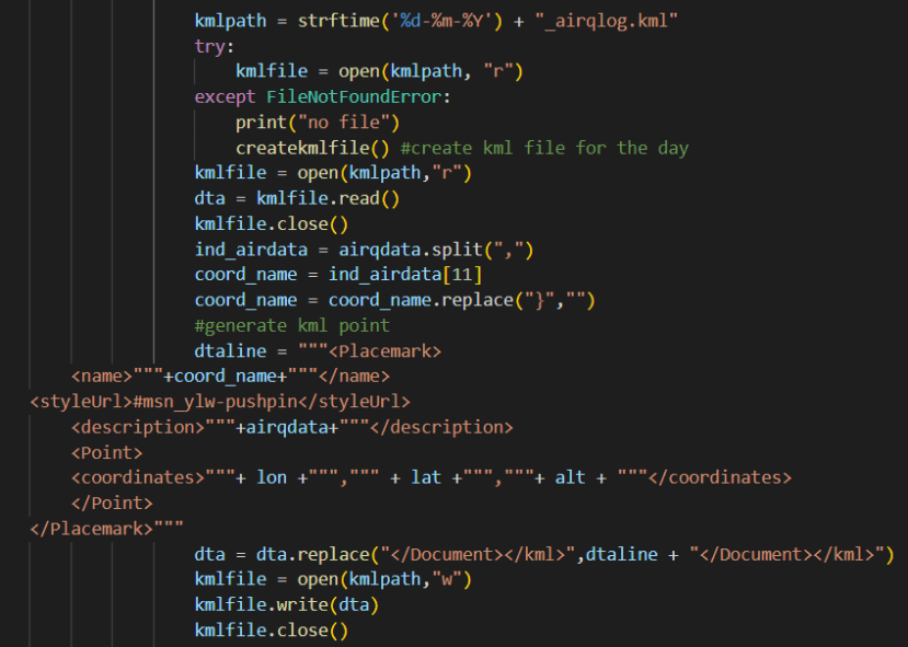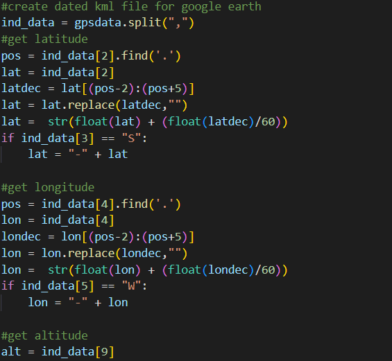 Nach dem Schreiben in die .csv-Datei fährt das Skript mit dem Schreiben in die .kml-Datei fort. kml-Dateien benötigen Breitengrad, Längengrad und Höhe, um einen gültigen Punkt auf einer Karte zu erzeugen. Also schrieb ich ein paar Codezeilen, die den Längengrad, Breitengrad und die Höhe aus dem NMEA-Datenformat extrahieren, das von der A9G-Platine übertragen wird.