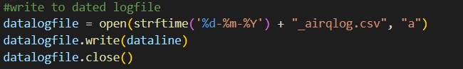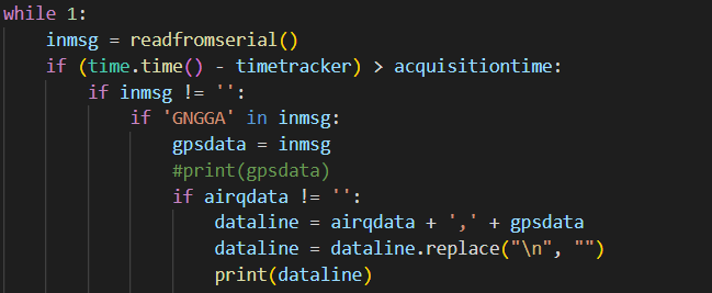 Wenn sowohl gültige Luftqualitätsdaten vom Kit als auch gültige GPS-Daten von der A9G-Platine vorliegen, fügen die nächsten drei Codezeilen die Luftqualitätsdaten und die GPS-Daten zu einem einzigen String zusammen, der dann in das .csv-Protokoll für diesen Tag geschrieben wird. Die Zeile „datalogfile = open(strftime('%d-%m-%Y') + "_airqlog.csv", "a")“ sorgt dafür, dass nur eine .csv-Datei pro Tag erstellt wird, so dass das Skript nicht jedes Mal eine neue Datei erzeugt, wenn das Kit am selben Tag neu gestartet wird.