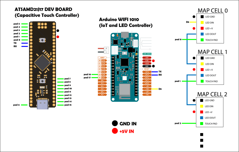 Ich musste jedoch die Empfindlichkeit und Erkennungsschwellen für alle Kartenbereiche kalibrieren. Ich sollte auch erwähnen, dass die Touch-Platine nicht alle Berührungen auf der Karte verarbeitet. Der ATSAMD21J17-Chip hat nur 16 Kanäle für die Eigenkapazitätserkennung. Die Karte hat jedoch 18 verschiedene Bereiche. Also musste ich die Berührungserkennung für die verbleibenden zwei Bereiche an die Arduino WIFI 1010-Platine delegieren, ähnlich wie ich es in Teil 1 dieses Projekts getan habe.