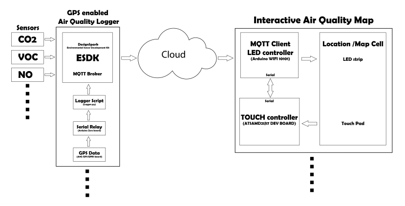 Neben der speziell angefertigten Leiterplatine, die den größten Teil der kapazitiven Berührungserkennung auf der Karte steuert, verwende ich auch eine Arduino WIFI 1010-Platine. Die Arduino-Platine steuert die adressierbaren LEDs auf der Karte und ermöglicht auch die IoT-Funktionen der Karte. Die kapazitive Berührungsplatine wird über eine ihrer seriellen Schnittstellen mit dem Arduino verbunden. Die gesendeten Berührungsdaten werden dann mit den Luftqualitäts- und GPS-Daten aus dem ESDK kombiniert und auf dem Arduino entsprechend verarbeitet.